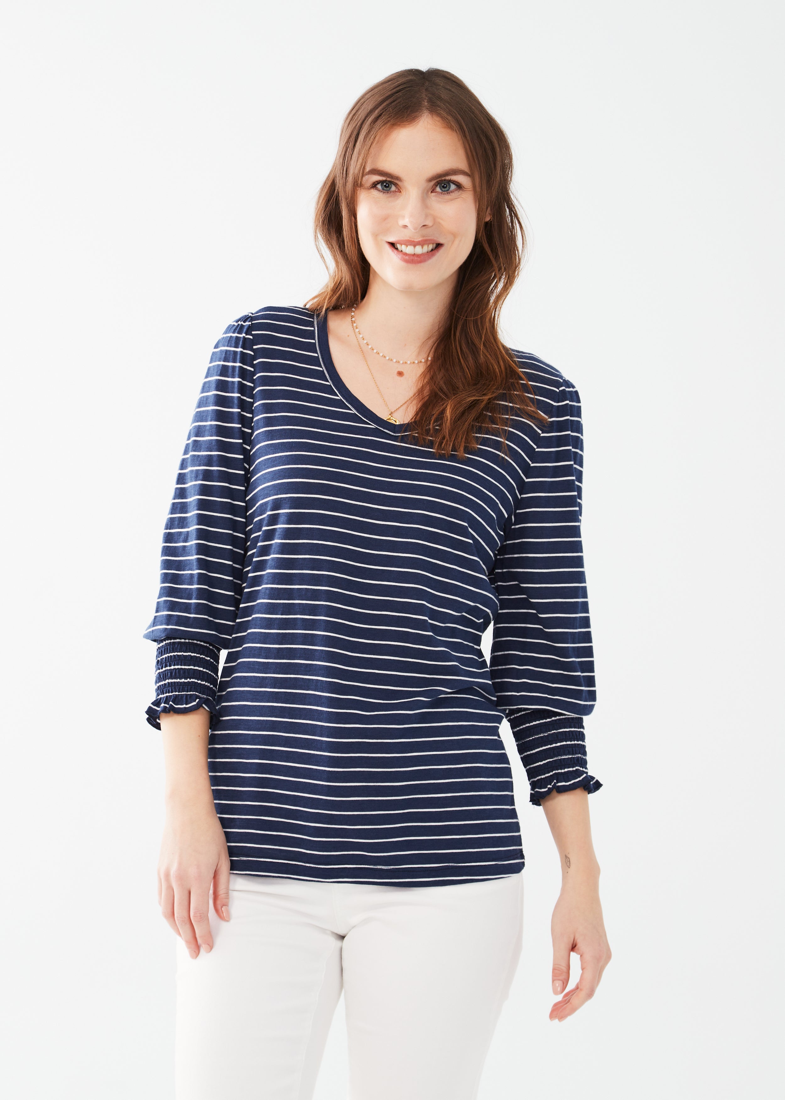 Striped V-Neck Top With Smocked Cuffs