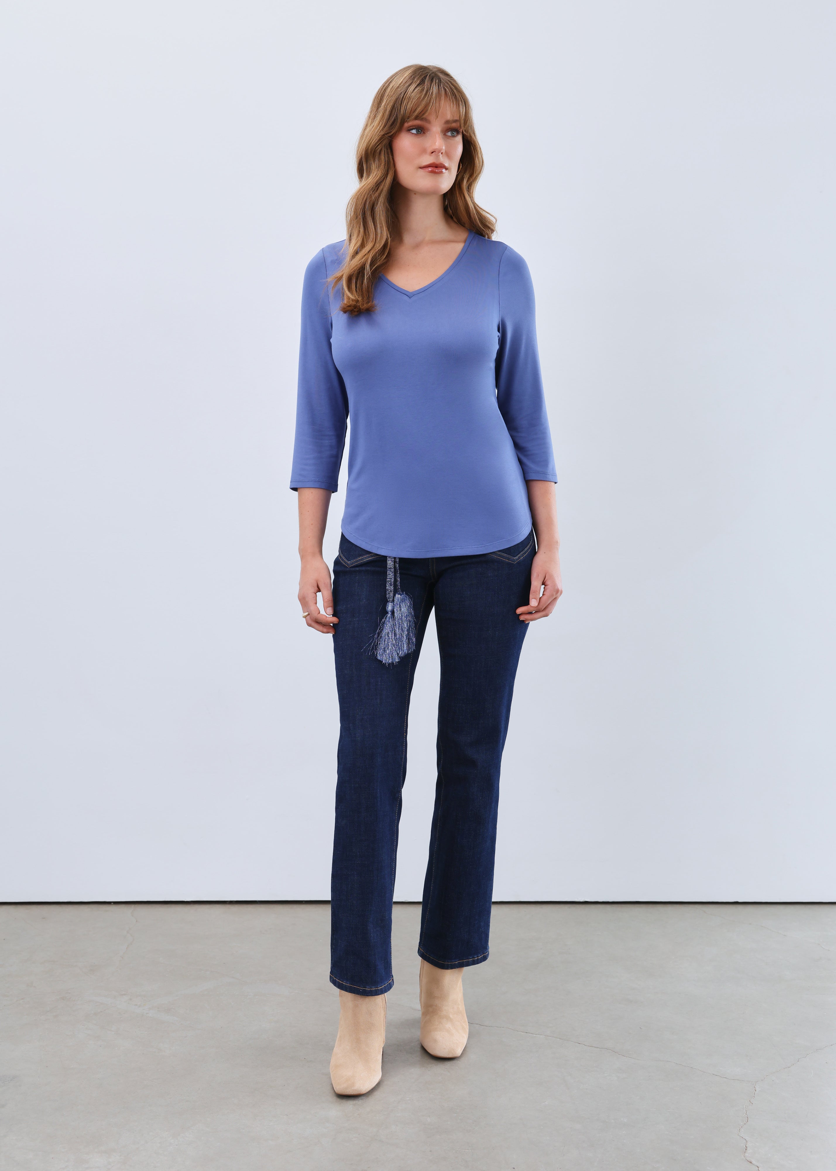 Encolure en V, manches 3/4 et tissu doux : ce haut en jersey coche toutes les cases du confort stylé. Avec ses couleurs faciles à agencer, vous ne pourrez vous en passer.