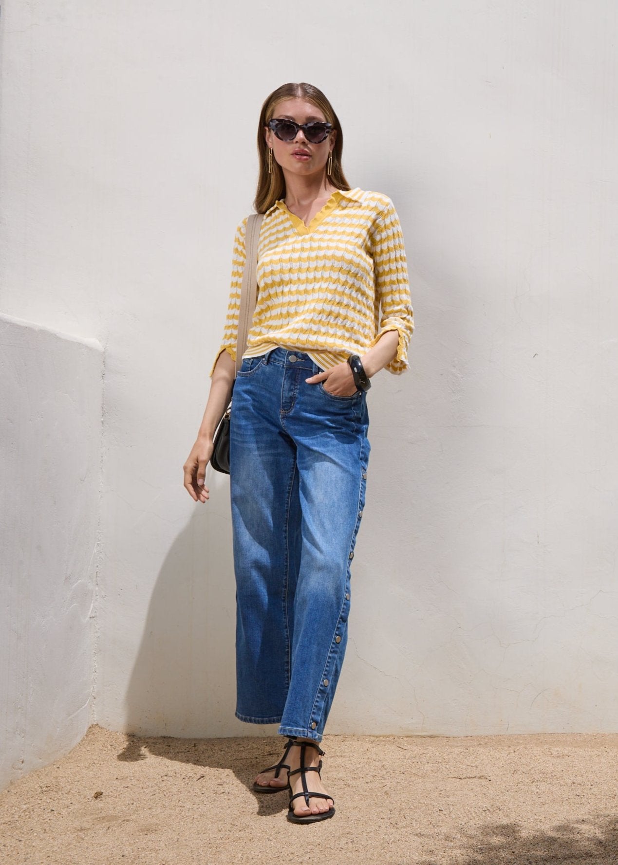3/4 Sleeve Polo Sweater, Yellow Stripe